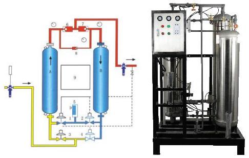 A、B 吸附塔 1、2、3、4 切换阀 5 消声器 6、7 止回阀 8 节流阀9 程序控制器