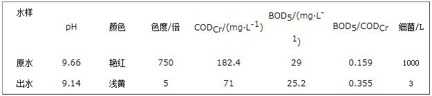 废水取自东莞某纺织印染厂的实际印染废水。该印染厂所用染料主要是活性、偶氮染料。印染废水用100目筛网过滤,去除大颗粒悬浮物,调节pH至9.66,臭氧质量流量为10.04 mg/min,处理60 min,废水基本脱色,其出水水质见表2。