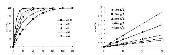 图2 pH对降解效果的影响 图3 相对于活性艳红X-3B的反应级数确定
