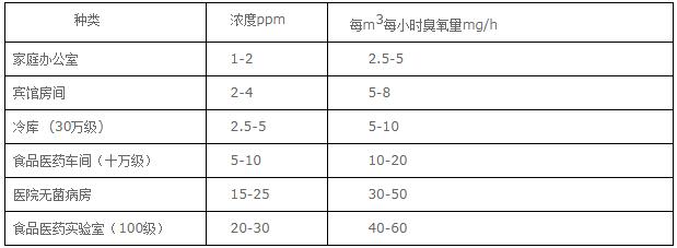 臭氧对空气中的微生物的灭活浓度和物体表面沉降的微生物的灭活浓度,根据卫生部1991年12月颁布的《消毒技术规范》第4.12臭氧应用章节中第8.2款消毒空气中规定“对密闭的空气用5~10mg/m3浓度(相当于2.5~5ppm)的臭氧作用30分钟;对物体表面的沉降菌落需要20~30mg/m3(相当于10~15ppm)”。制药行业应用臭氧的目的是用来代替紫外线和化学熏蒸,对整个洁净区空气及机械设备,介质材料表面的沉降菌落进行大消毒。需要的臭氧浓度为10~15ppm,相当于每立方空气中臭氧含量20~30mg。