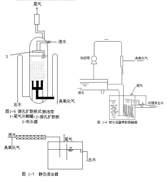 高性能臭氧氧化法处理效果的主要因素除污染物的性质、浓度、臭氧投加量、溶液pH值、温度、反应时间外,气态O3的投加方式亦很重要。O3的投加通常在混合反应器中进行。混合反应器(接触反应器) 的作用有二;①促进气、水扩散混合;②使气、水充分接触,迅速反应;③增长臭氧气体在水中的停留时间;设计混合反应器时要考虑臭氧分子在水中的扩散速度和与污染物的反应速度。当扩散速度较大,而反应速度为整个臭氧化过程的速度控制步骤时,混合接触器的结构形式应有利于反应的充分进行。属于这一类的污染物有烷基磺酸钠、焦油、CODcr 、BOD5、污泥、氨氮等,反应器可采用微孔扩散板式鼓泡塔。当反应速度较大、扩散速度为整个臭氧化过程的速度控制步骤时,结构型式应有利于臭氧的加速扩散。属于这一类的污染物有铁(II)、锰(II)、氰、酚、亲水性染料、细菌等,一般净水处理可采用喷射器作为反应器,效果较为理想。